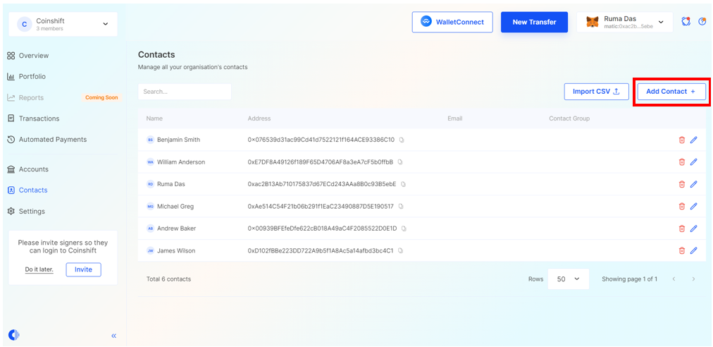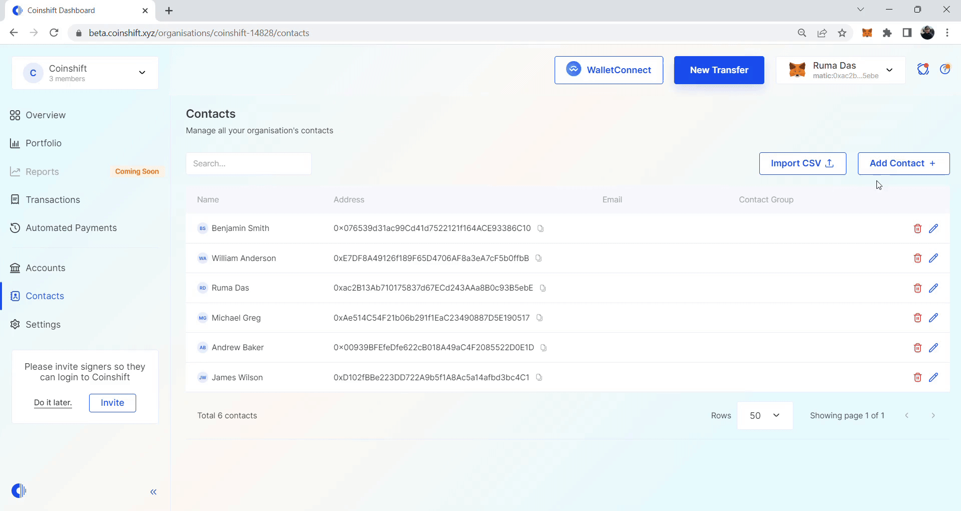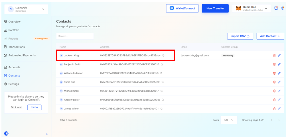 You can effortlessly add a community member's contact address to an organisation on Coinshiftarrow-up-right.
